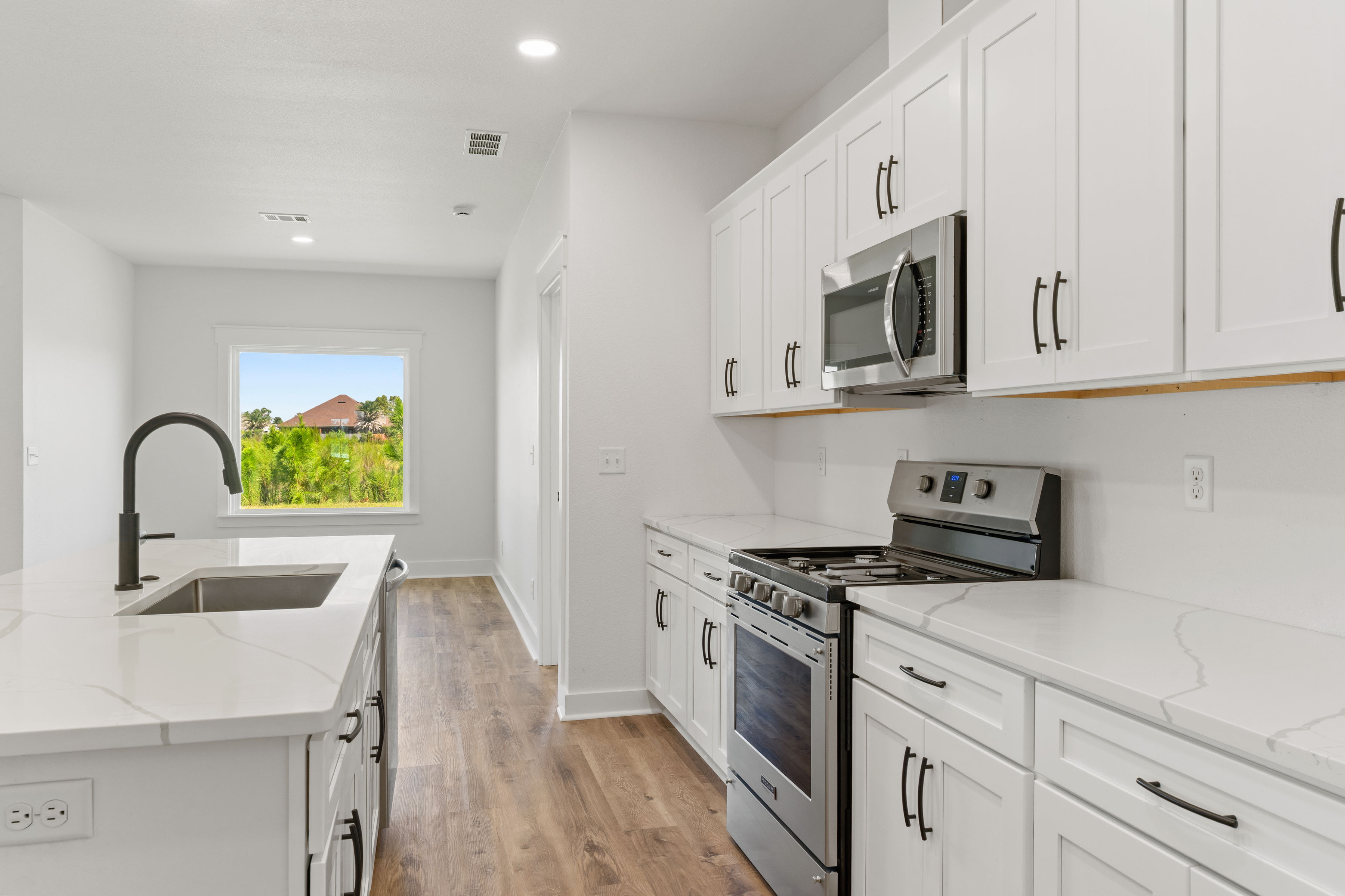 - Stainless steel appliances including oven, dishwasher, and microwave